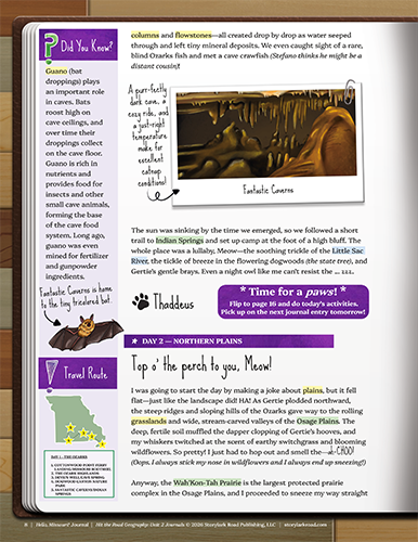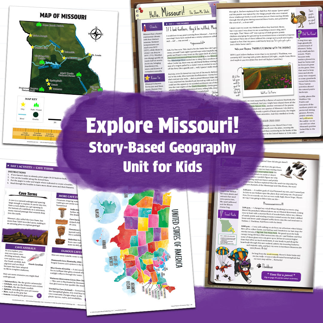 Hit the Road Geography is a 180-day elementary curriculum divided into four units, each with a story-based Journals book and a companion Activities book. Together, they take students on a playful road trip through all 50 statesโled by Thaddeus, a hilariously charming traveling cat. Through vivid journal entries and engaging activities, learners explore landmarks, landforms, and natural wonders as if theyโre visiting each place in person. (See Thaddeus's Travel Route for the list of states in Units 1-4.)